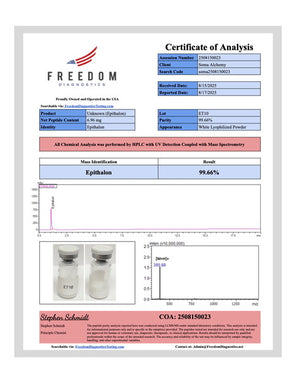 Epithalon (also spelled Epitalon) is a synthetic version of the naturally occurring peptide epithalamin, which is secreted by the pineal gland. Extensively studied for its anti-aging effects, Epithalon has been shown to increase telomerase activity, the enzyme responsible for maintaining and repairing telomeres, the protective caps at the ends of chromosomes that naturally shorten with age.